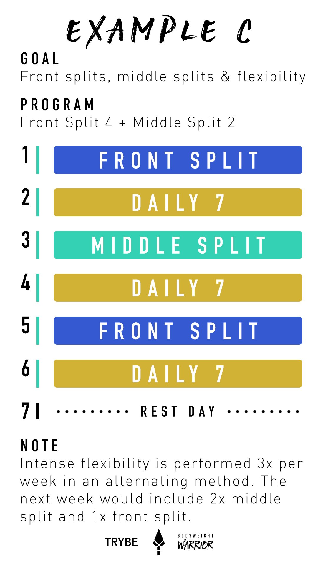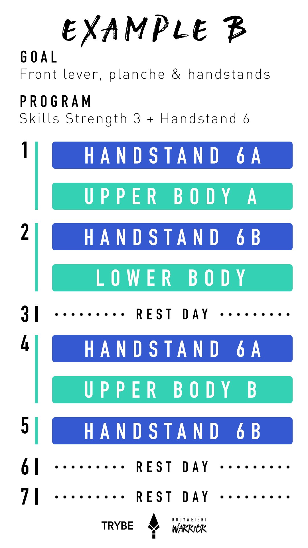 Layer programs around strength - Strength workouts are your primary sessions as they’re more demanding and can affect other sessions. Skills and flexibility should then be considered modular add-ons. Flexibility can be performed on the same day after your strength session. Try to pair muscle groups or patterns, for example, upper body flexibility after upper body days or front splits after lower body. Skills work, like handstands, should be performed prior to strength sessions as it is more neurologically taxing. If you want to perform these “add-on” sessions on different days just consider how DOMs or fatigue from strength sessions may affect them, giving sufficient rest between.