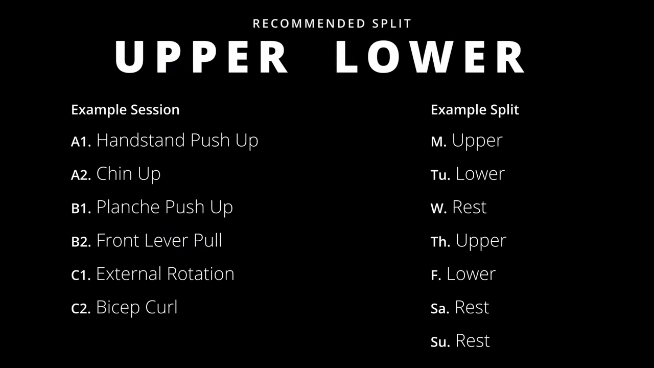 For intermediate strength levels, I recommend splitting your workouts into BAS (bent arm strength) and SAS (straight arm strength). Legs can be trained separately.