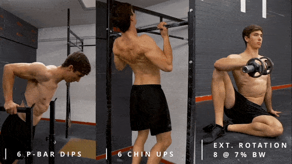 The dip and the chin-up are the bread and butter of basic calisthenics and will equip you with general strength that will place you well for moving on to more difficult moves, and also other sports. The external rotation is added as a measure of structural balance but also a protective measure as we move further into skills.